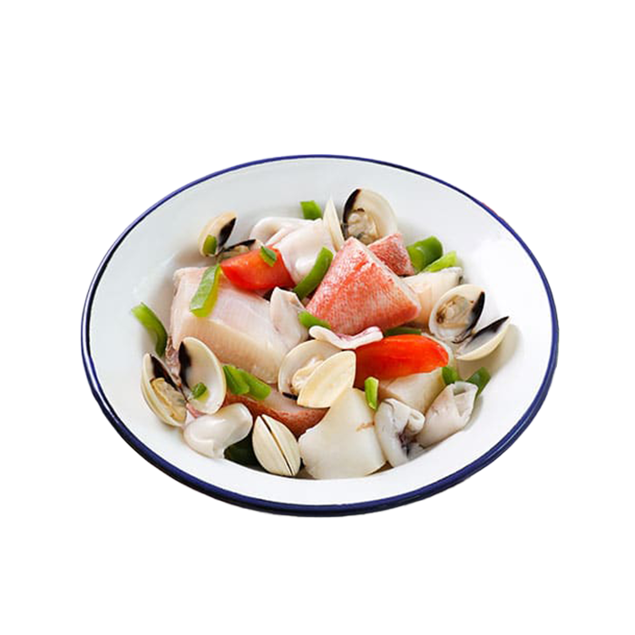 A selection of mixed fish combined with vegetables and spices, perfect for preparing the classic Portuguese Caldeirada fish stew. Ideal for a rich, aromatic, and comforting seafood dish.